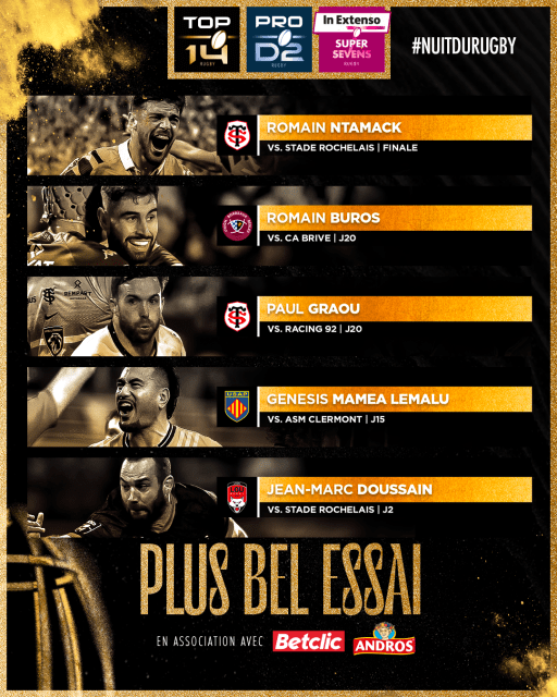 Le championnat français est chaque année source de spectacle, avec des essais majestueux. Pour cette année, cinq joueurs sont en lutte afin de savoir remportera le prix du plus bel essai du TOP 14. Parmi ces acteurs, on retrouve Romain Ntamack (Stade Toulousain) ; Romain Buros (Union Bordeaux-Bègles) ; Paul Graou (Stade Toulousain) ; Genesis Mamea Lemalu (USA Perpignan) ; Jean-Marc Doussain (LOU Rugby).
