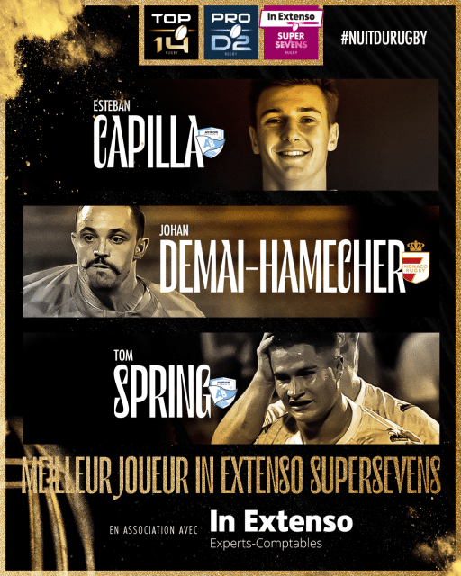 Il y a quelques semaines, se déroulaient les finales de l’IN EXTENSO SUPERSEVENS remportées par les Barbarians Français. Tout au long de la compétion, trois joueurs se sont distingués et ont été nommés pour recevoir le titre du meilleur joueur. Quid d’Esteban Capilla (Aviron Bayonnais) ; de Johan Demai-Hamecher (Monaco Rugby Sevens) ou de Tom Spring (Aviron Bayonnais) recevra ce trophée ?