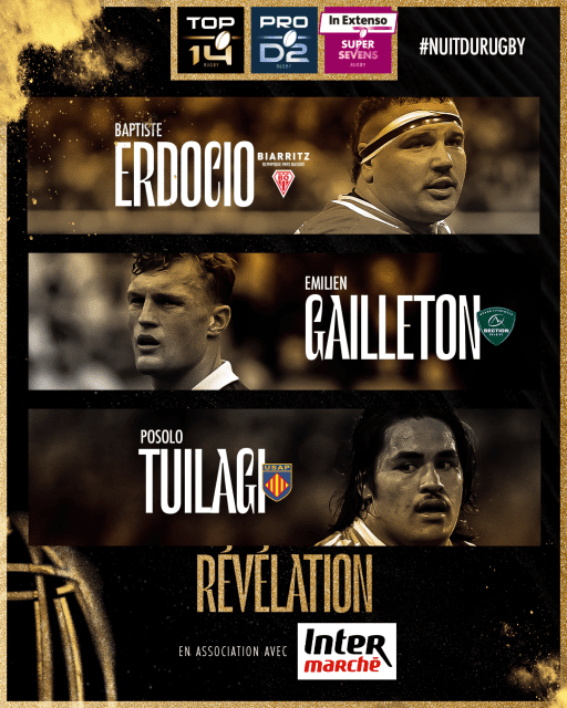 Des jeunes joueurs, talentueux et qui ont déjà fait parler cette saison. Que ça soit en TOP 14, PRO D2 ou lors de la Coupe du Monde U20, une chose est sûre : on entendra leurs noms pour longtemps. Cette saison, sont nominés pour le prix de révélation de l’année : Baptiste Erdocio (Biarritz Olympique) ; Emilien Gailleton (Section Paloise) ; Posolo Tuilagi (USA Perpignan).
