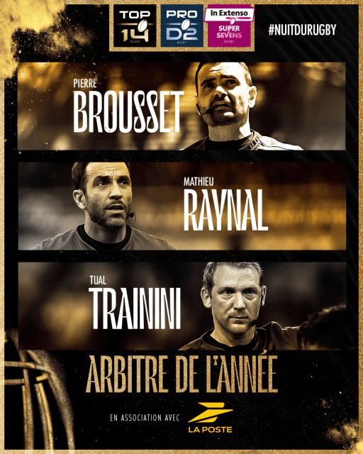 La Nuit du Rugby célèbre et récompense nos arbitres français. Ils ont pu arbitrer au plus haut niveau, lors de la finale du TOP 14 ou bien même lors de la dernière Coupe du Monde. Pour le titre du meilleur arbitre de l’année, on retrouve donc Pierre Brousset ; Mathieu Raynal ; Tual Trainini.