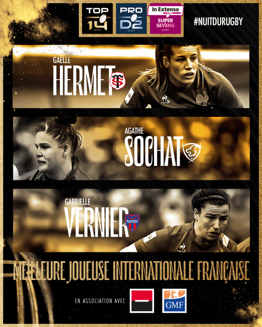 Avec la Coupe du Monde en Nouvelle-Zélande et le Six Nations féminin qui a battu le record d’affluence pour un match (Angleterre-France), le rugby féminin a pris une autre dimension cette saison. Dans le XV de France féminin, trois joueuses ont réussi de grandes prestations et sont en course pour le titre de meilleure joueuse internationale française. A savoir Gaëlle Hermet (Stade Toulousain) ; Agathe Sochat (Stade Bordelais) ; Gabrielle Vernier (Blagnac Rugby).