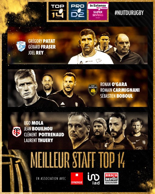 Dans la première division française, nombreux sont les staffs d’entraîneurs ayant de très grandes qualités. Cette saison, trois d’entre eux se sont distingués. Grégory Patat, Gérard Fraser et Joël Rey (Aviron Bayonnais) ; Ronan O’Gara, Romain Carmignani et Sébastien Boboul (Stade Rochelais) ; Ugo Mola, Jean Bouilhou, Clément Poitrenaud et Laurent Thuery (Stade Toulousain).
