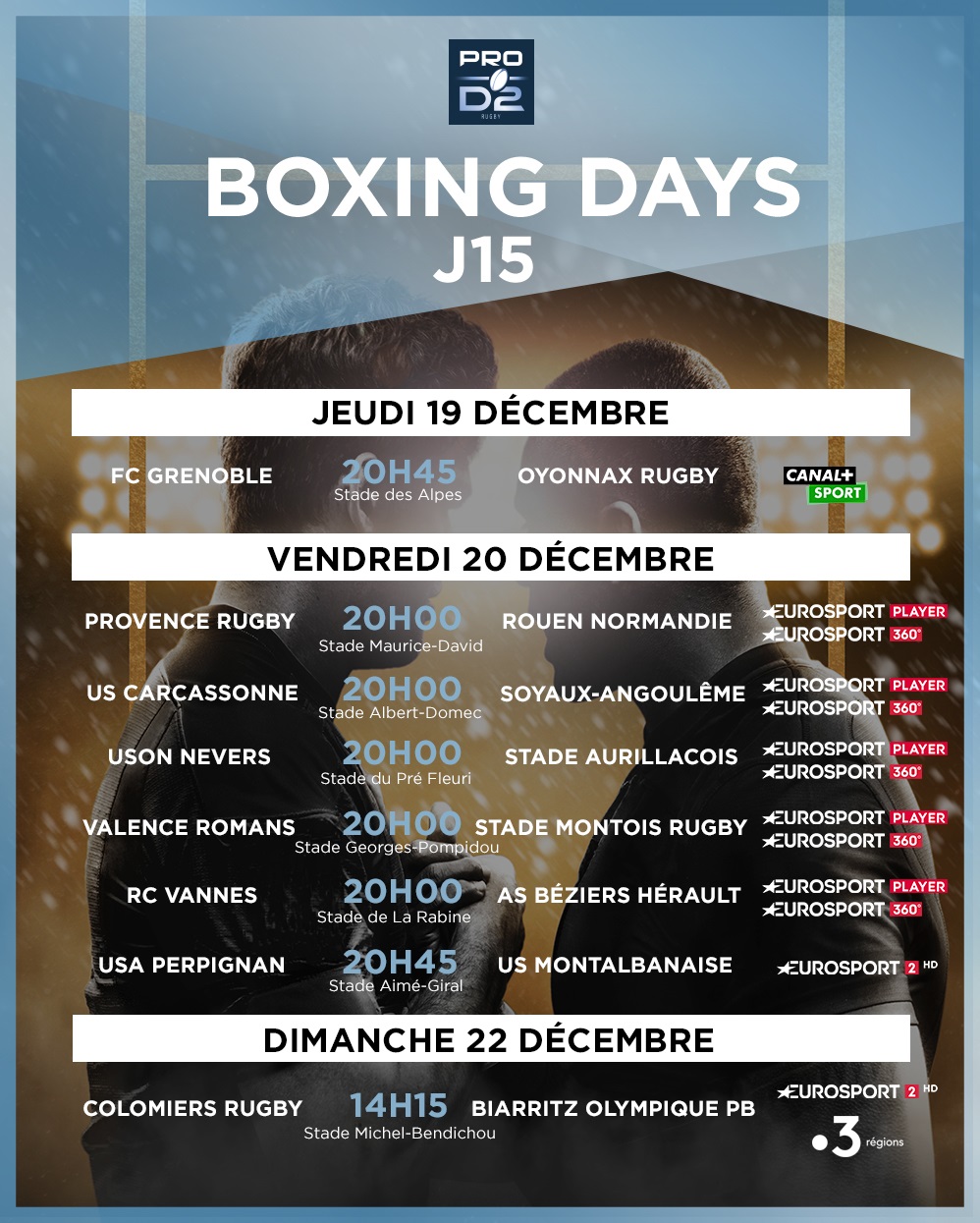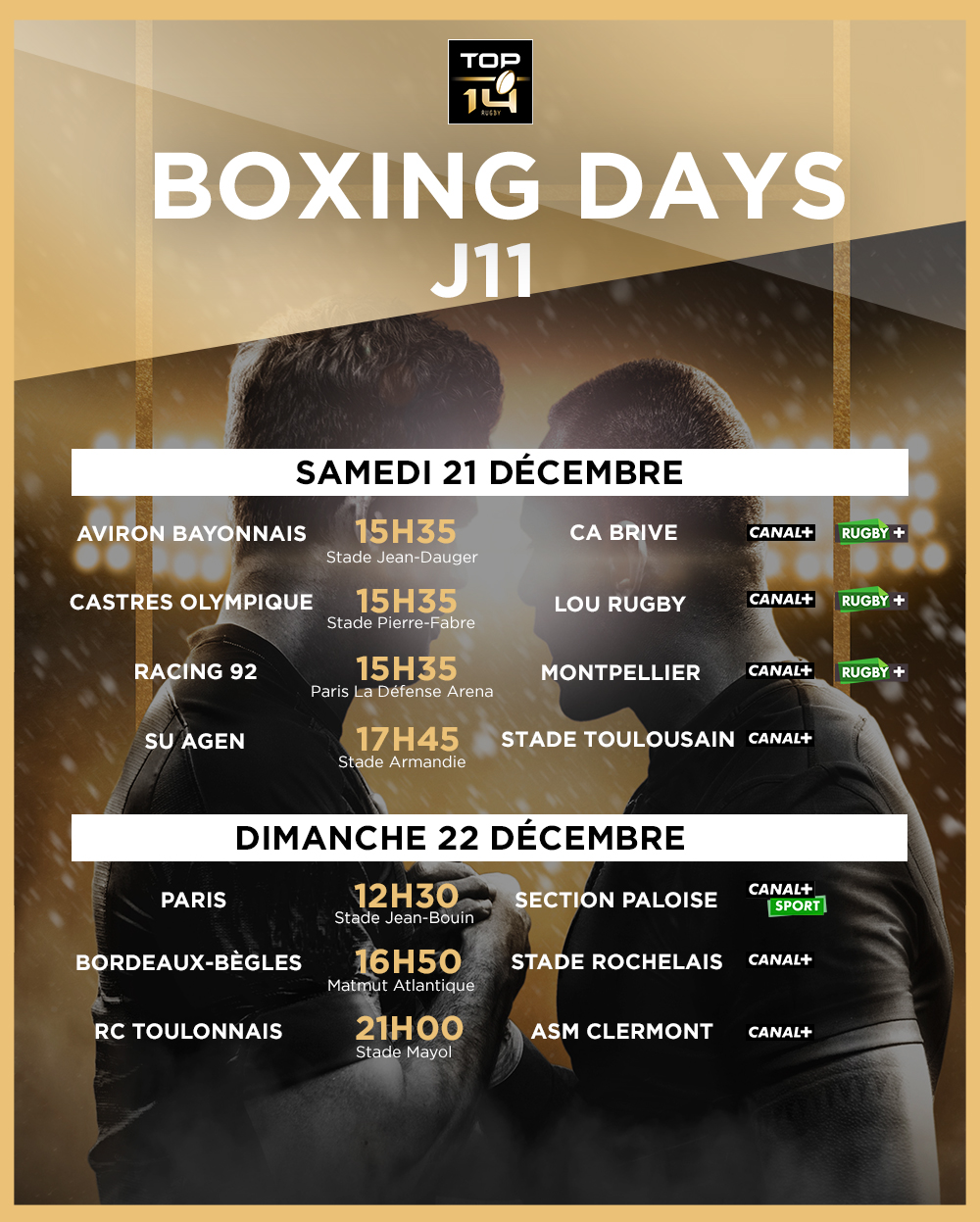Cette année, les fameux Boxing Days se dérouleront les weekends du 21 décembre (TOP 14 & PRO D2) et du 28 décembre (TOP 14).