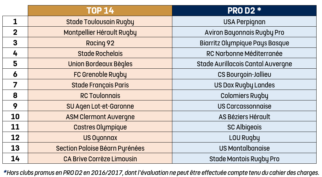Le Comité Directeur a arrêté le classement des centres de formation des clubs professionnels basé sur l’évaluation des résultats sportifs et scolaires obtenus lors de la saison 2015/2016. Ce classement a ainsi été établi et présenté en reprenant la composition du TOP 14 et de la PRO D2 de la saison dernière. Ces résultats sont fortement liés au parcours sportif de la génération de joueurs pris en compte dans la période d’évaluation (2013/2014, 2014/2015 et 2015/2016).