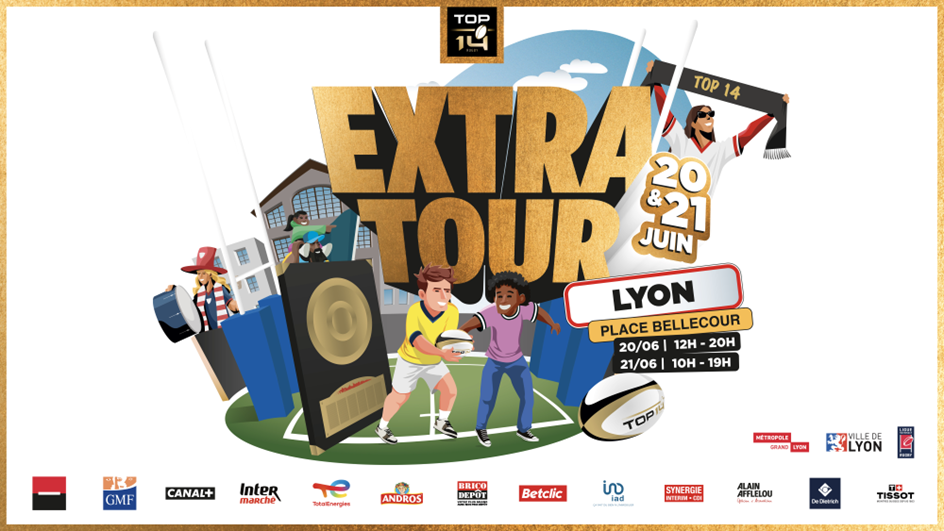Rendez-vous vendredi 20 et samedi 21 juin à Lyon sur le village du TOP 14 Extra Tour Place Bellecour pour célébrer les demi-finales du TOP 14 et la grande fête du rugby !