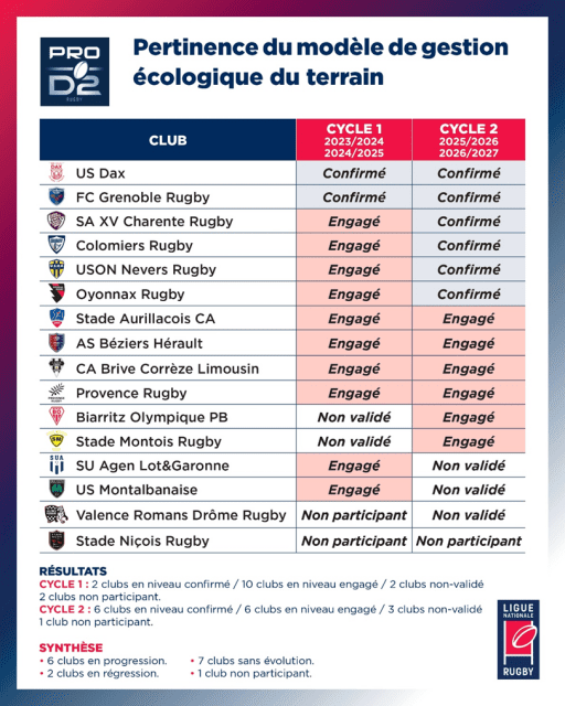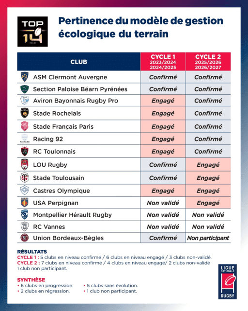 À l’issue du deuxième cycle d’évaluation, dont les résultats sont présentés aujourd'hui, la LNR a constaté une progression générale des clubs dans leur démarche écoresponsable, avec 13 clubs qui ont désormais atteint le niveau “Confirmé” (contre 7 en 2024).