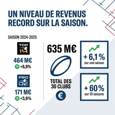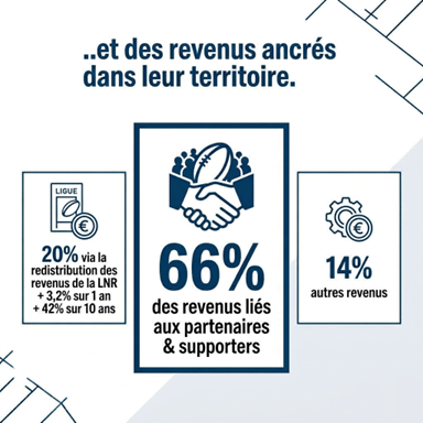 Cette croissance illustre l’attractivité du rugby professionnel français dont 66 % des revenus proviennent du lien avec les spectateurs et les partenaires des clubs (partenariats & hospitalités, recettes matches et merchandising). La redistribution des revenus de la LNR représente 20 % des budgets des clubs, en progression de +3,2 % par rapport à la saison précédente et de +42 % sur les dix dernières saisons. Tous les postes de produits d'exploitation s'affichent à la hausse.