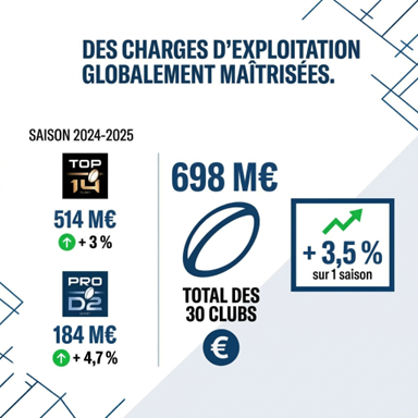 La saison 2024/2025 a été marquée par une croissance modérée des charges d'exploitation, de +3,5 % au global. Dans le détail, cette croissance est de +3 % en TOP 14 et +4,7 % en PRO D2.