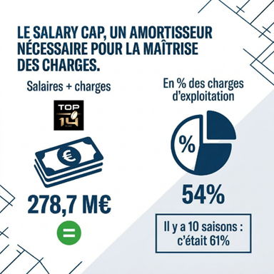 La performance du TOP 14 dans la gestion des charges s’explique notamment par l'effet conjugué de la politique de gestion des clubs et du Salary Cap, qui permet une stabilité de la masse salariale autour de 200 M€. Au total, les salaires ainsi que les charges sociales représentent 54 % du total des charges d'exploitation (contre 61 % il y a 10 ans). 10 des 14 clubs de l'élite se situent au-dessus de 95 % de leur plafond global de masse salariale sportive (fixé à 10,7 M€).