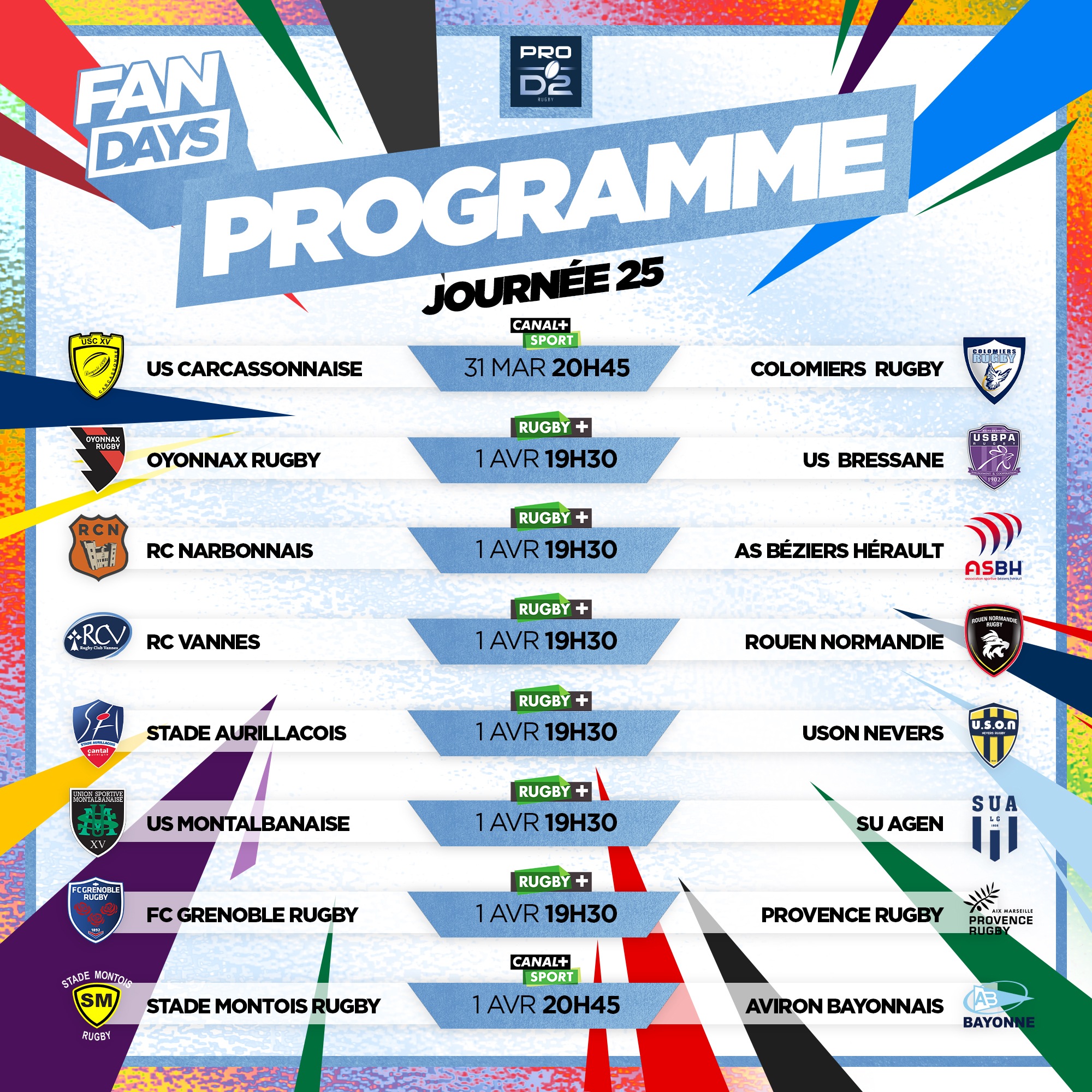 Les fans seront aussi à l’honneur des Fan Days en PRO D2 : l’US Carcassonne et l’US Colomiers ouvriront le bal le jeudi à 20h45 pour se donner la chance de vivre une fin de saison au sommet tandis que le vendredi, le RC Narbonnais et l’AS Béziers en découdront au stade de la Méditerranée, l’Ain retrouvera son derby avec le match US Oyonnax / US Bressane, le RC Vannes et le Rouen Normandie Rugby tenteront de marquer les Fan Days du sceau de la victoire, au même titre que Provence Rugby et le FC Grenoble. Quant à l’US Montalbanaise, le printemps sera ensoleillé si elle l’emporte face au SU Agen, bien déterminé à sécuriser son maintien au plus vite. L’USON Nevers cherchera aussi à sécuriser une place dans les 6 face au Stade Aurillacois.