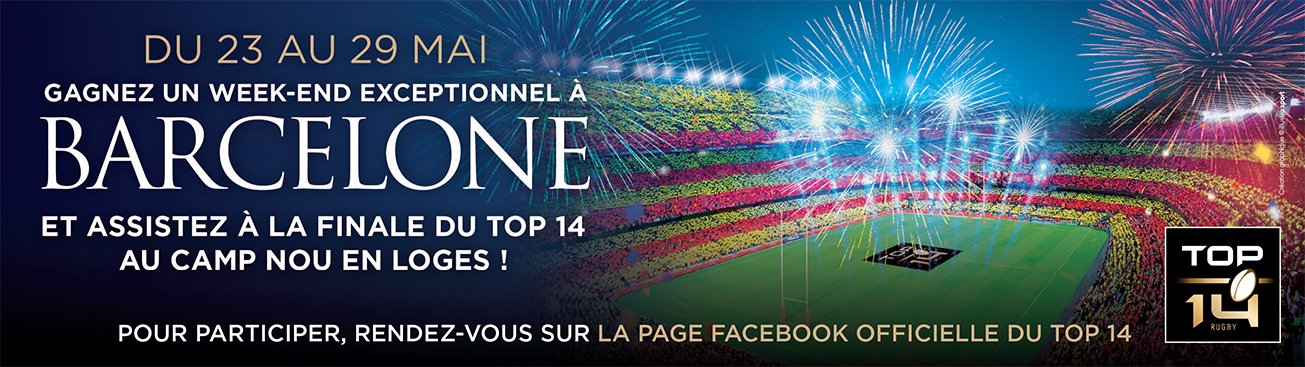 Tentez de gagner un séjour à Barcelone à l'occasion de la finale du TOP 14 et assistez au match et au show exceptionnel de Bob Sinclar en loge VIP ! Rendez-vous sur la page facebook officielle du TOP 14 pour participer !