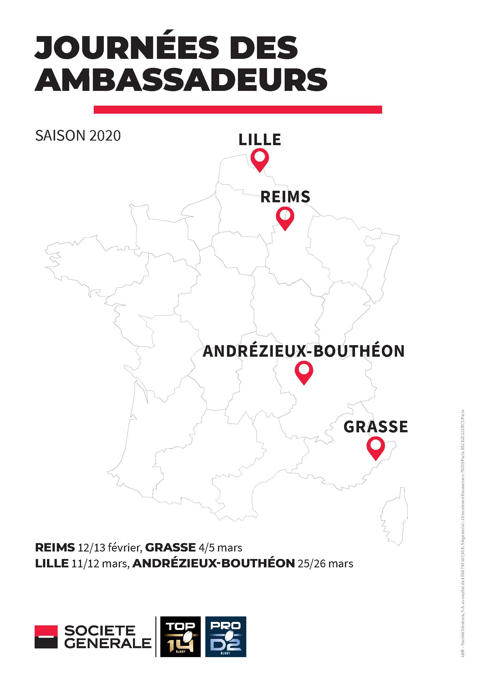 Chaque année, pendant 2 jours, rugby professionnel et rugby amateur ne font plus qu'un pour rendre accessible le rugby à tous. Au cours des Journées des Ambassadeurs, joueurs, arbitres, entraîneurs de TOP 14 et de PRO D2 partent à la rencontre de passionnés du ballon ovale pour porter haut l'esprit sportif et les valeurs du rugby.