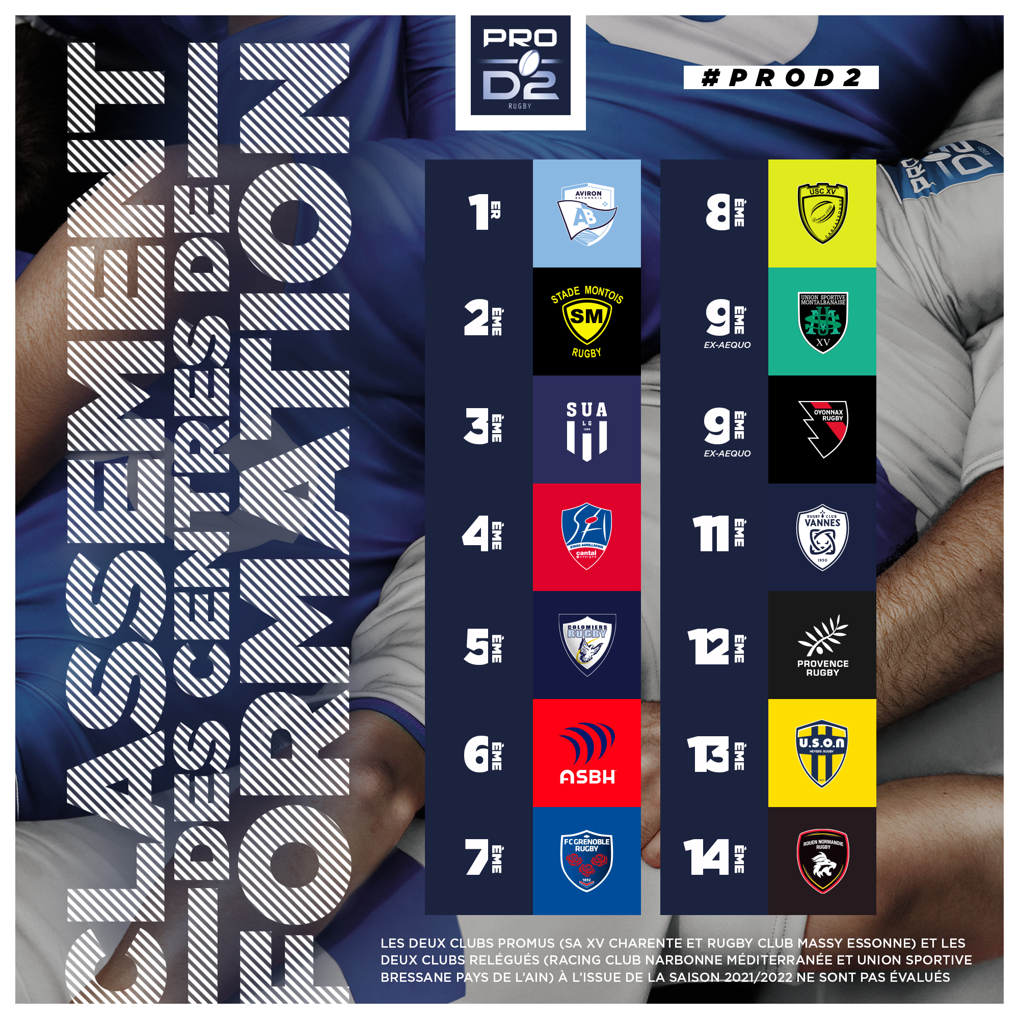 * Les deux Clubs promus (SA XV Charente et Rugby Club Massy Essonne) et les deux Clubs relégués (Racing Club Narbonne Méditerranée et Union Sportive Bressane Pays de l’Ain) à l’issue de la saison 2021/2022 ne sont pas évalués
