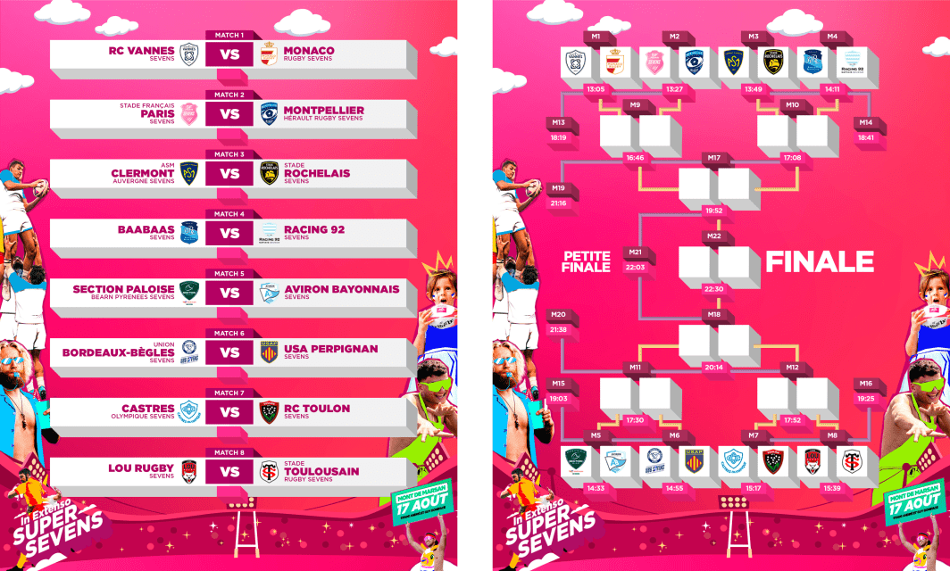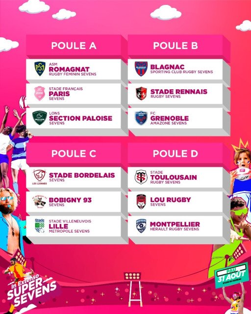 Les 16 équipes s’affronteront au cours d’une première étape qualificative pendant l’étape estivale de Pau le 31 août. A l’issue de cette dernière, les 4 meilleures équipes au classement général, qualifiées pour la grande finale, se retrouveront sur la pelouse de Paris La Défense Arena pour tenter de remporter le premier titre de championne de France de rugby à 7 de clubs.