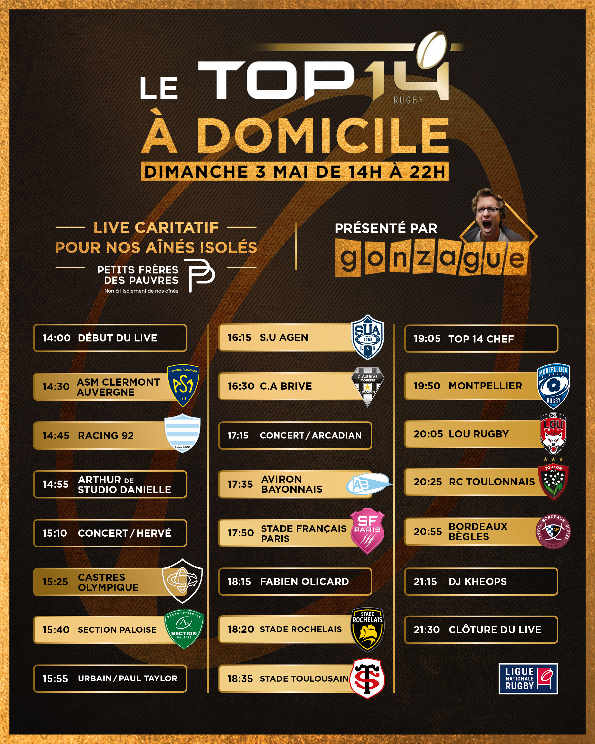 Le Youtubeur Gonzague animera ce grand live et les 14 clubs du TOP 14 feront vivre ce véritable TOP 14 à domicile de 14h à 22h. Les plus grands joueurs du TOP 14, parmi lesquels, Nans Ducuing, Anthony Bouthier, Gaël Fickou, Thomas Ramos, Matthieu Jalibert, Baptiste Serin, Yoann Maestri, Félix Lambey ou encore Jules Plisson, et de nombreux membres de staffs et arbitres participeront dimanche en répondant aux questions en direct ainsi qu'en réalisant des "#confinement challenges" pour faire grimper la cagnotte au profit des Petits Frères des Pauvres.