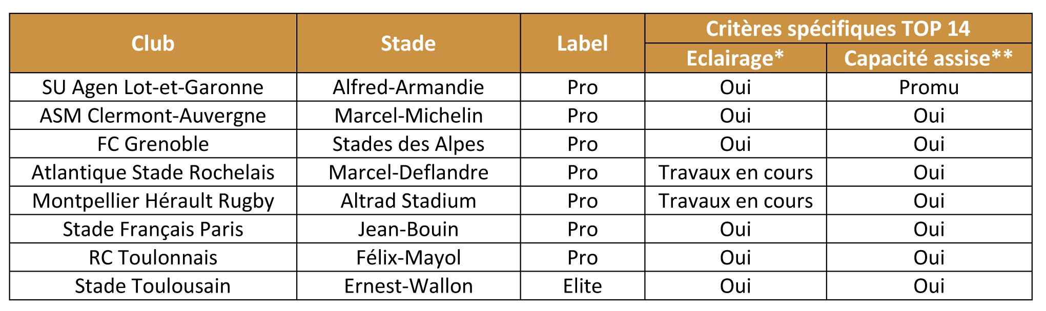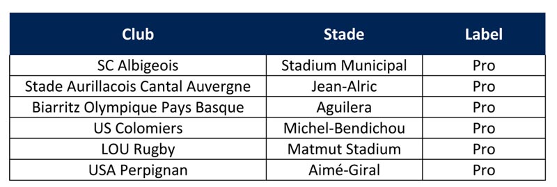 Six clubs de TOP 14 et six clubs de PRO D2 ont également accès au fond Label Stades 2015/2016 au titre du programme de travaux sur lequel ils se sont engagés et qui doivent être réalisés à l’échéance de l’intersaison 2016 pour les clubs de TOP 14 et de l’intersaison 2017 pour les clubs de PRO D2.