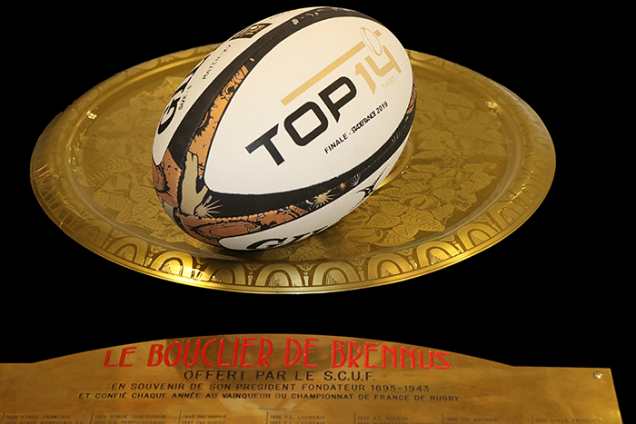 Les adversaires ne sont pas encore connus, mais le ballon du match est déjà prêt. Spécialement personnalisé pour l’occasion, il symbolise des mains touchant le Bouclier de Brennus, Graal absolu pour tout joueur de rugby. Son aspect collector en fera sans nul doute un joli souvenir à s’offrir pour les supporters… et à récupérer après le coup de sifflet final par les vainqueurs du jour.