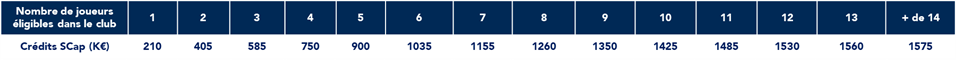 La réforme introduit donc un plafond cumulé de crédits internationaux par club. Ce plafond dépend du nombre de joueurs du club figurant sur la Liste Premium : il est fixé à 210 000 € pour 1 joueur (avec un montant par joueur qui est dégressif : 202 500€ pour 2 joueurs, 195 000€ pour 3 joueurs et ainsi de suite) et augmente par paliers jusqu’à un maximum de 1,575 M€ pour 14 joueurs et plus.