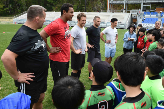 La ville de Kamaishi au JAPON, surnommée « rugby town », a été totalement détruite par le tsunami de mars 2011. Le club de rugby des Kamaishi Seawaves est rapidement devenu un facteur autant qu’un moteur de la résilience, de la solidarité et de la reconstruction de la région. Et le futur nouveau stade, un symbole. Il accueillera deux matchs de la Coupe du Monde de Rugby. Le 19 mai avait lieu un match contre Taïwan. Les ambassadeurs les ont aidés à préparer ce rendez-vous symbolique et leur ont partagé le message de tous les peuples rencontrés auparavant.