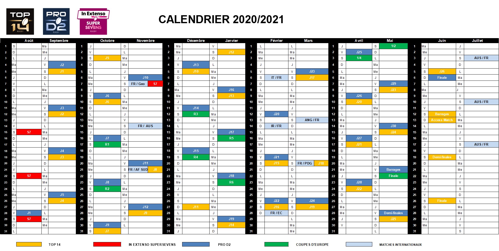 Le calendrier de la saison 2020/2021 du TOP 14 et de la PRO D2 a été adopté lors du Comité Directeur de la LNR ces mardi 4 et mercredi 5 février 2020.